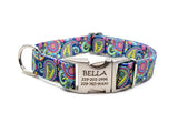 Our colorful and vibrant polyester webbing collars with personalized buckle are some of the coolest personalized buckle dog collars on the planet. These collars are made with UV, Rot, Mildew and Moisture resistant polyester webbing printed with a dye sublimation process that permanently infuses the vibrant colors into the material. Lightweight, strong and silky smooth to caress your pups neck in comfort!