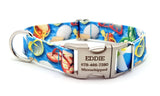 Our colorful and vibrant polyester webbing collars with personalized buckle are some of the coolest personalized buckle dog collars on the planet. These collars are made with UV, Rot, Mildew and Moisture resistant polyester webbing printed with a dye sublimation process that permanently infuses the vibrant colors into the material. Lightweight, strong and silky smooth to caress your pups neck in comfort!